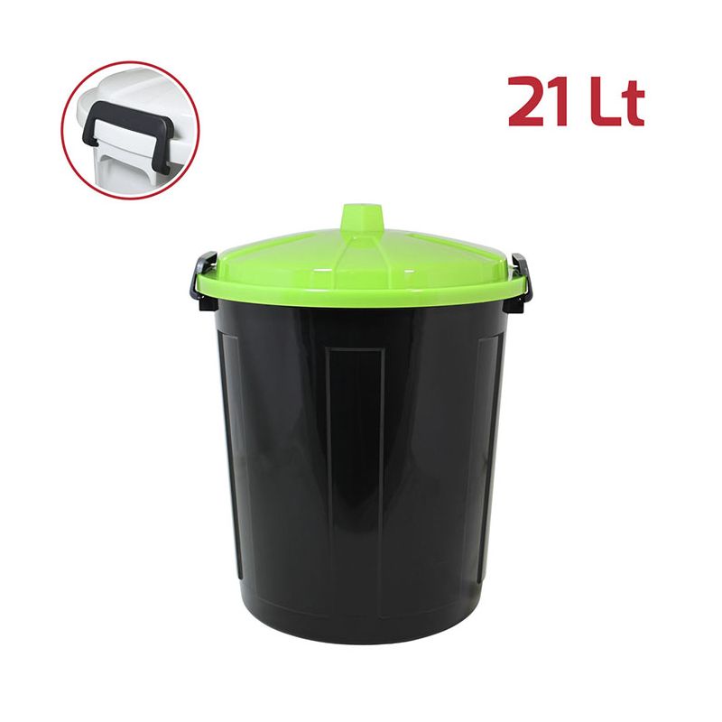 Bidone Maxi 21Lt in PP nero con coperchio verde e chiusure in plastica. Pratico bidone utile sia in ambienti professionali che domestici e adatto sia all'uso esterno che interno: ideale per la spazzatura, per la cura dell'orto o del giardino. Le chiusure in plastica assicurano che i rifiuti e gli odori rimangano all'interno. Il materiale in cui è realizzato rende il bidone resistente, duraturo e facile da pulire grazie alla superficie lucida. Con la vasta gamma di colori e le diverse capacità sono ideali anche per la raccolta differenziata.