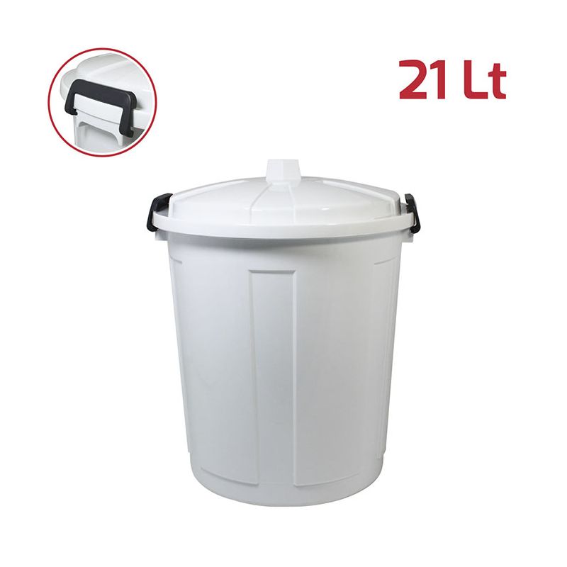 Bidone Maxi 21Lt con coperchio in PP bianco ghiaccio e chiusure in plastica. Pratico bidone utile sia in ambienti professionali che domestici e adatto sia all'uso esterno che interno: ideale per la spazzatura, per la cura dell'orto o del giardino. Le chiusure in plastica assicurano che i rifiuti e gli odori rimangano all'interno. Il materiale in cui è realizzato rende il bidone resistente, duraturo e facile da pulire grazie alla superficie lucida. Con la vasta gamma di colori e le diverse capacità sono ideali anche per la raccolta differenziata.