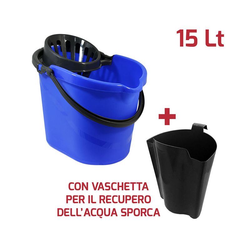 Secchio Evergreen da 15lt in PP blu con manico, strizzatore per mop e vaschetta per il recupero dell'acqua sporca da 6Lt in PP antracite. Sulla superficie interna del secchio è presente una scala graduata per un dosaggio ottimale dei detersivi ed è dotato di beccuccio e fondo ergonomico per svuotarlo facilmente. Lo strizzatore e la vaschetta sono removibili assicurando una pulizia perfetta del prodotto. Dal design senza tempo, robusto, pratico e realizzato con materiali certificati e di alta qualità, è l’ideale per la pulizia di qualsiasi ambiente, sia domestico che professionale.