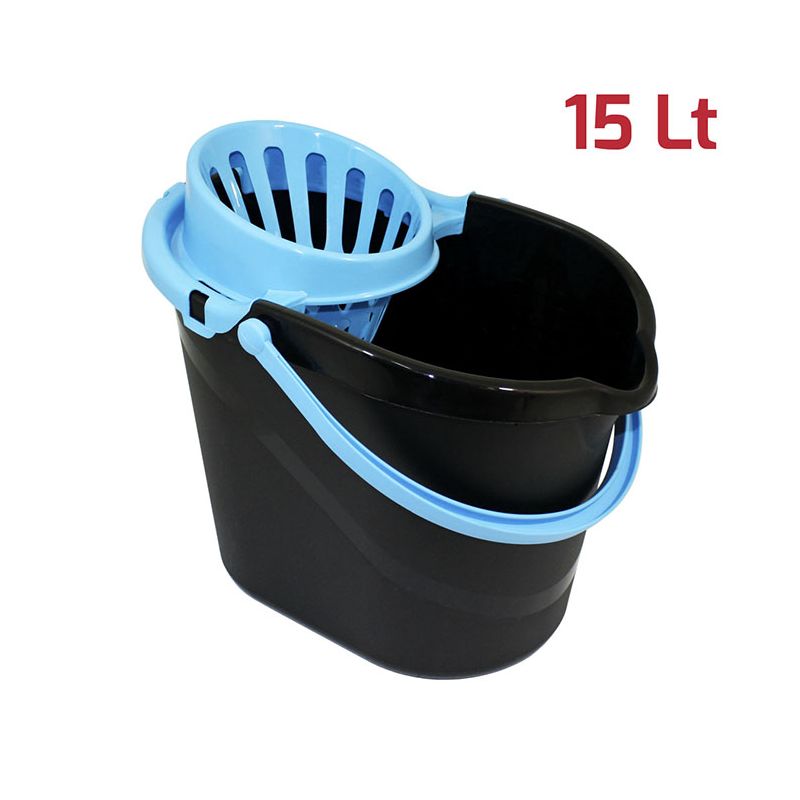 Secchio Evergreen da 15lt in PP nero con manico e strizzatore per mop in PP azzurro. Sulla superficie interna del secchio è presente una scala graduata per un dosaggio ottimale dei detersivi ed è dotato di beccuccio e fondo ergonomico per svuotarlo facilmente. Lo strizzatore è removibile assicurando una pulizia perfetta del prodotto. Dal design senza tempo, robusto, pratico e realizzato con materiali certificati e di alta qualità, è l’ideale per la pulizia di qualsiasi ambiente, sia domestico che professionale. Può essere abbinato alla vaschetta per il recupero dell’acqua sporca da 6lt.