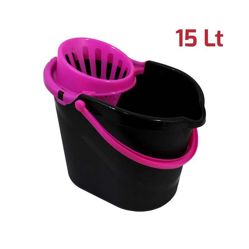 Secchio Evergreen da 15lt in PP nero con manico e strizzatore per mop in PP magenta. Sulla superficie interna del secchio è presente una scala graduata per un dosaggio ottimale dei detersivi ed è dotato di beccuccio e fondo ergonomico per svuotarlo facilmente. Lo strizzatore è removibile assicurando una pulizia perfetta del prodotto. Dal design senza tempo, robusto, pratico e realizzato con materiali certificati e di alta qualità, è l’ideale per la pulizia di qualsiasi ambiente, sia domestico che professionale. Può essere abbinato alla vaschetta per il recupero dell’acqua sporca da 6lt.