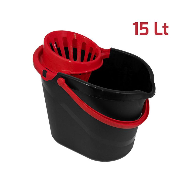 Secchio Evergreen da 15lt in PP nero con manico e strizzatore per mop in PP rosso. Sulla superficie interna del secchio è presente una scala graduata per un dosaggio ottimale dei detersivi ed è dotato di beccuccio e fondo ergonomico per svuotarlo facilmente. Lo strizzatore è removibile assicurando una pulizia perfetta del prodotto. Dal design senza tempo, robusto, pratico e realizzato con materiali certificati e di alta qualità, è l’ideale per la pulizia di qualsiasi ambiente, sia domestico che professionale. Può essere abbinato alla vaschetta per il recupero dell’acqua sporca da 6lt.