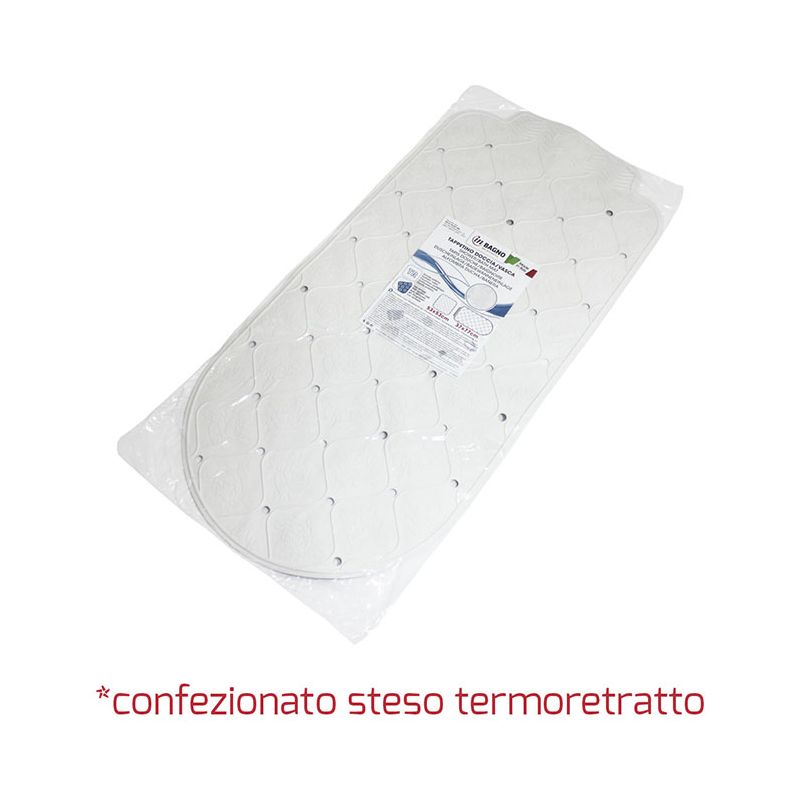Tappetino per vasca in gomma sintetica bianco con decoro a tema floreale. La superficie della vasca è spesso molto scivoloso e questo tappetino diventa indispensabile. Grazie alle numerose e forti ventose presenti sotto, il tappetino è antiscivolo e sicuro. Aderisce perfettamente al piano della vasca e sulla confezione sono presenti le istruzioni per posizionarlo al meglio. I fori invece permettono all'acqua di defluire sotto il tappetino una volta che viene svuotata la vasca. Per le sue dimensioni, può essere usato anche nelle docce più grandi.