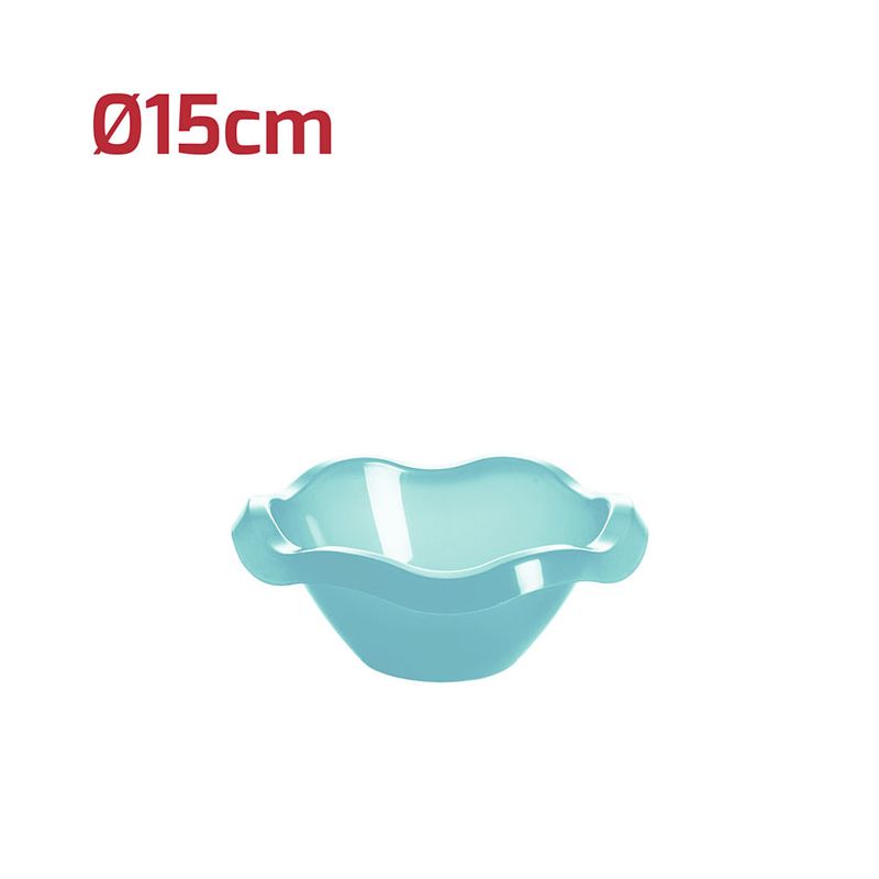 Coppetta Vanity Ø 14,5 cm in PP azzurro trasparente ideale per servire stuzzichini, salse, macedonie o gelati. Con il suo bordo ondulato e i colori accesi renderà la tavola allegra e spiritosa. Può essere lavata in lavastoviglie.