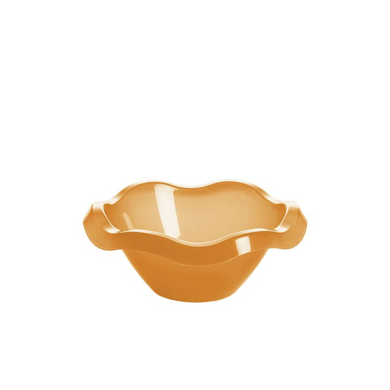 Coppetta Vanity Ø 14,5 cm in PP arancione trasparente ideale per servire stuzzichini, salse, macedonie o gelati. Con il suo bordo ondulato e i colori accesi renderà la tavola allegra e spiritosa. Può essere lavata in lavastoviglie.