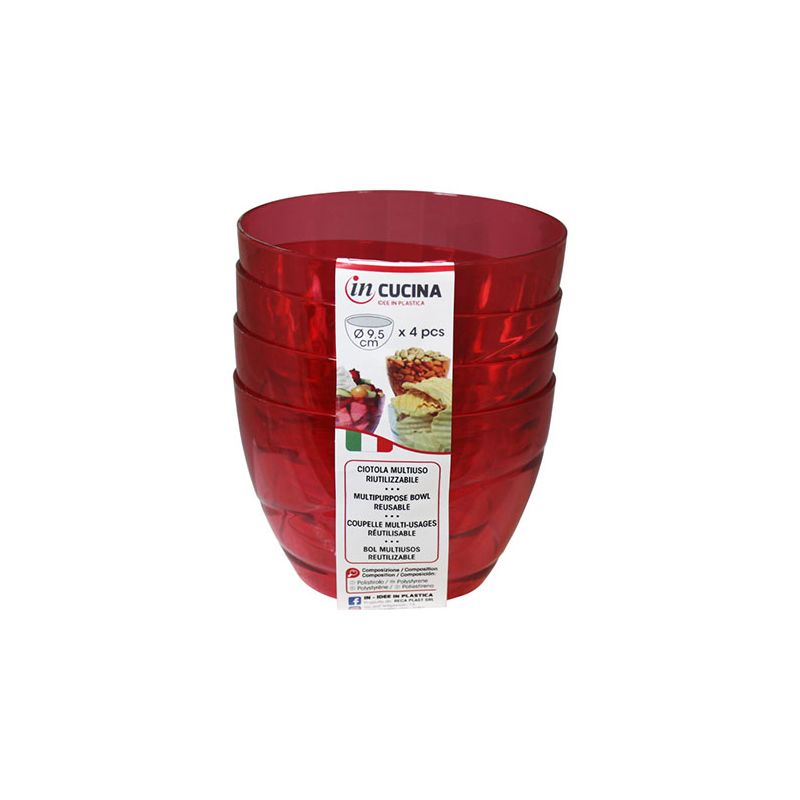 Kit di 4 coppette Allegra Ø 9,5 cm in PS rosso trasparente ideali per servire stuzzichini, salse, macedonie o gelati. Dal design semplice ma raffinato si adatta a tutte le occasioni, dalle più formali alle feste per bambini. È riutilizzabile e lavabile in lavastoviglie.