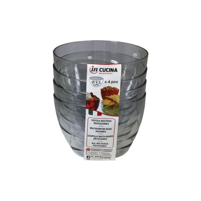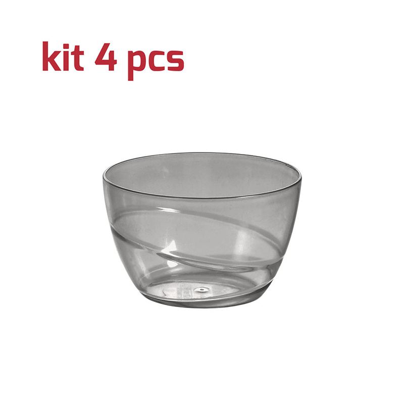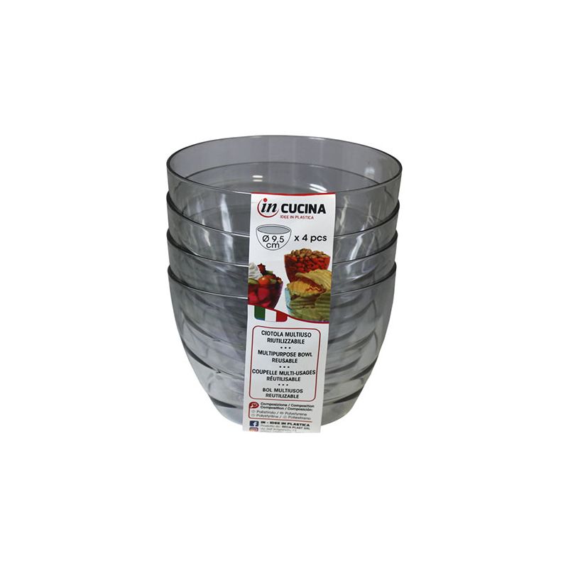 Kit di 4 coppette Allegra Ø 9,5 cm in PS antracite trasparente ideali per servire stuzzichini, salse, macedonie o gelati. Dal design semplice ma raffinato si adatta a tutte le occasioni, dalle più formali alle feste per bambini. È riutilizzabile e lavabile in lavastoviglie.
