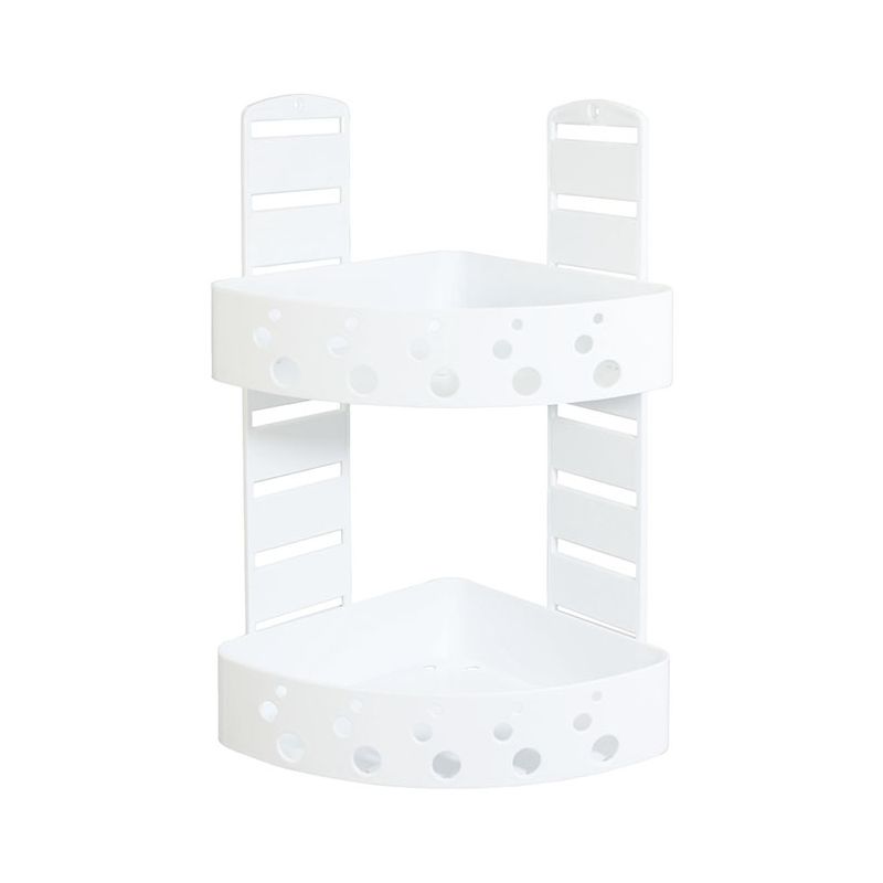 Mensola a 2 ripiani angolare per doccia in PS antiurto bianco. Grazie alle fessure sui supporti è possibile decidere la posizione dei 2 ripiani, che possono essere riposizionati a piacimento quando si vuole, così da adattarsi a tutte le esigenze. Ogni ripiano ha il fondo forato per permettere all'acqua di defluire. Il materiale plastico di cui è composta riduce al minimo la visibilità dei residui di calcare e rende la pulizia facile e veloce in quanto non è necessario utilizzare detergenti specifici per superfici cromate. Inoltre i ripiani removibili permettono un'igiene perfetta. Pratica e comoda sia per sfruttare al massimo lo spazio all'interno della doccia sia per chi vuole tenere a portata di mano ed organizzati shampoo e saponi. Il montaggio a muro con le viti rende la mensola stabile e grazie al materiale antiurto sarà durevole nel tempo. Le istruzioni e il kit per il montaggio a muro sono inclusi nella confezione.