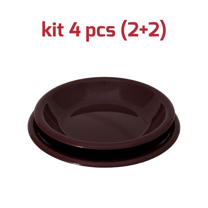 Kit di 4 piatti Elegance, 2 piatti piani + 2 piatti fondi in PP vinaccia. Dal design semplice e pulito sono ideali per l'uso quotidiano ma anche per occasioni speciali. Sono riutilizzabili, robusti, comodi e lavabili in lavastoviglie. Grazie ai numerosi colori disponibili è facile creare combinazioni che renderanno la tua tavola unica e originale.