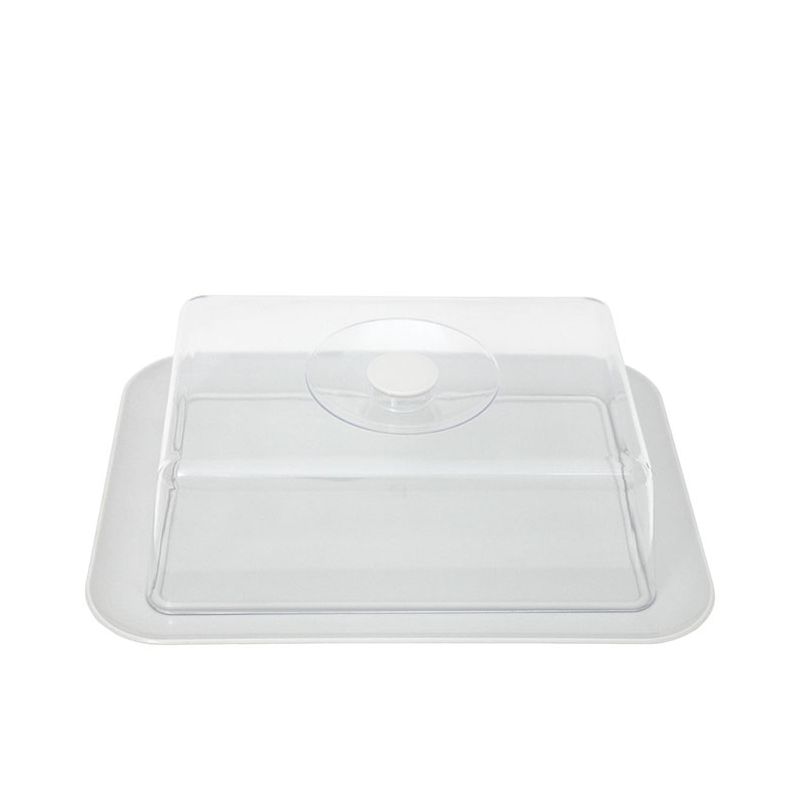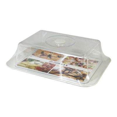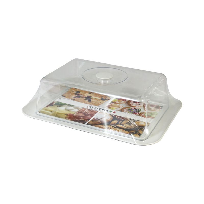 Vassoio rettangolare in PS bianco panna e cloche trasparente. È indicato per dolci di massimo 24x16cm oppure può essere usato anche per formaggi e salumi per un aperitivo. Il suo aspetto cristallino e il design semplice rende il prodotto elegante e raffinato, ideale per conservare o servire a tavola.