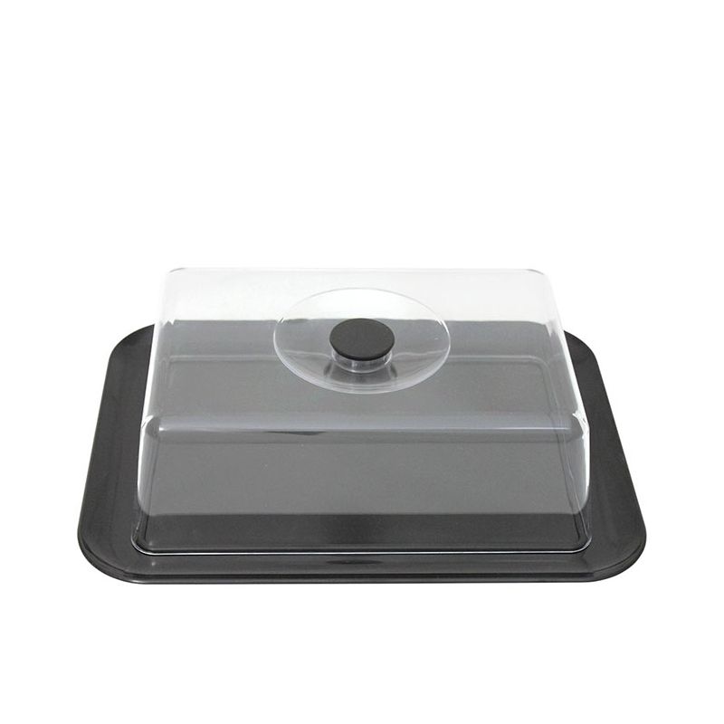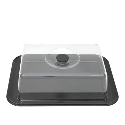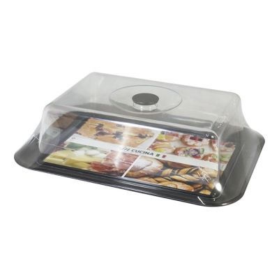 Vassoio rettangolare in PS nero caldo e cloche trasparente. È indicato per dolci di massimo 24x16cm oppure può essere usato anche per formaggi e salumi per un aperitivo. Il suo aspetto cristallino e il design semplice rende il prodotto elegante e raffinato, ideale per conservare o servire a tavola.