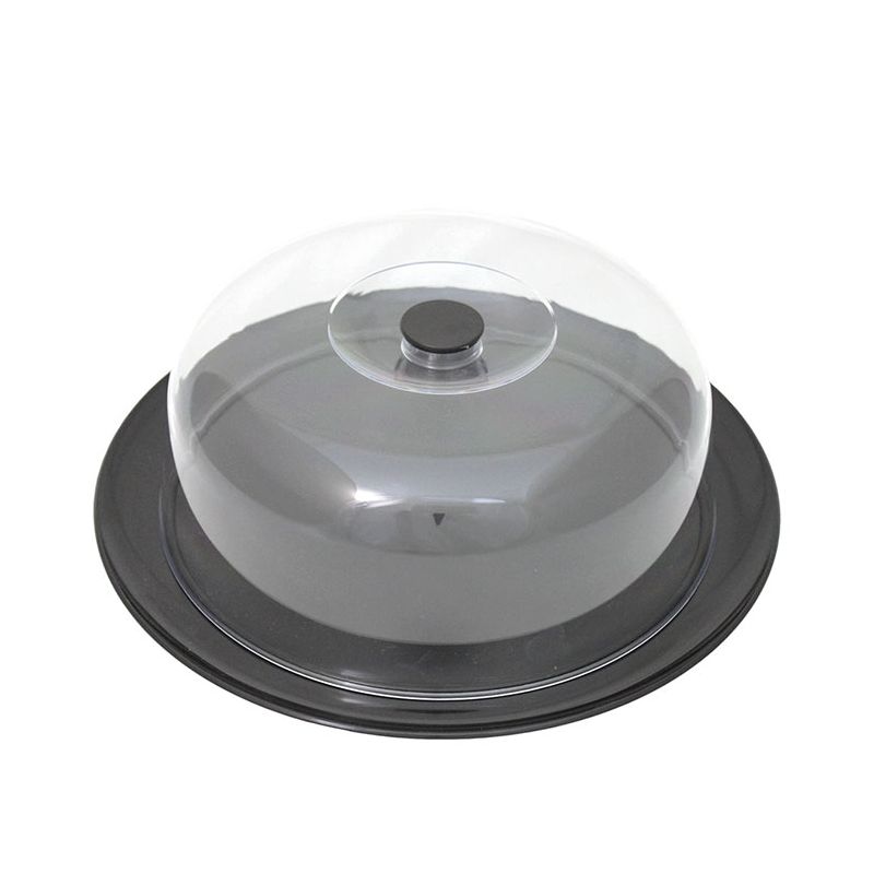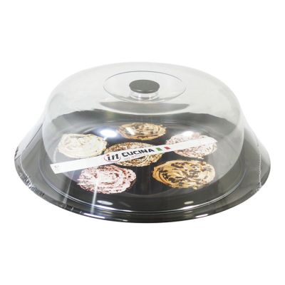 Vassoio tondo in PS nero caldo e cloche trasparente. È indicato per dolci di diametro massimo di 24cm oppure muffin e biscotti. Il suo aspetto cristallino e il design semplice rende il prodotto elegante e raffinato, ideale per conservare o servire i dolci a tavola.