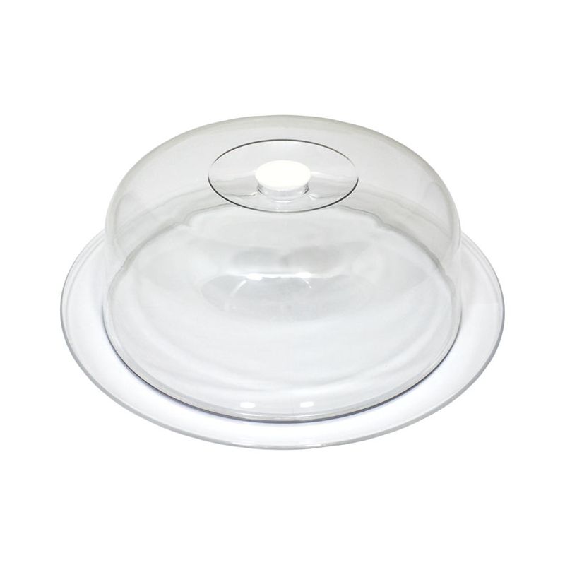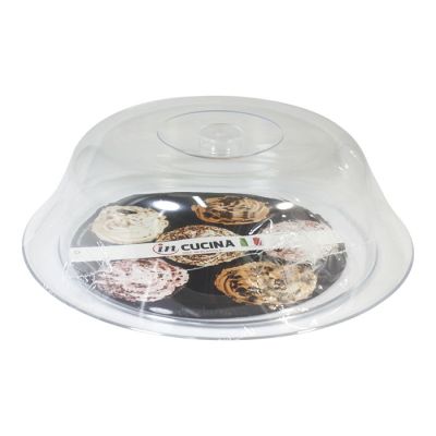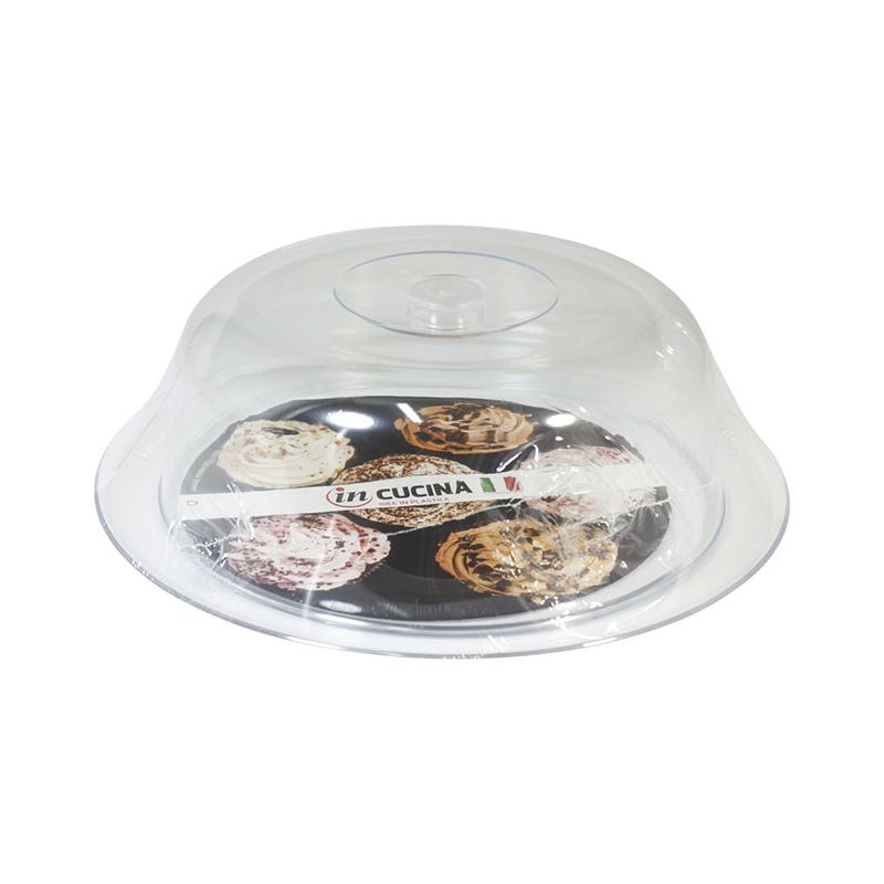 Vassoio tondo in PS trasparente e cloche trasparente. È indicato per dolci di diametro massimo di 24cm oppure muffin e biscotti. Il suo aspetto cristallino e il design semplice rende il prodotto elegante e raffinato, ideale per conservare o servire i dolci a tavola.