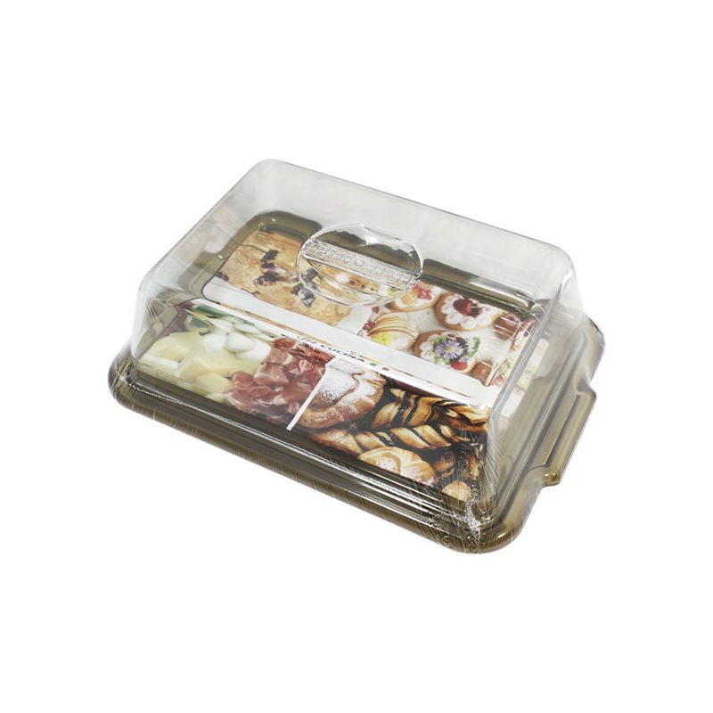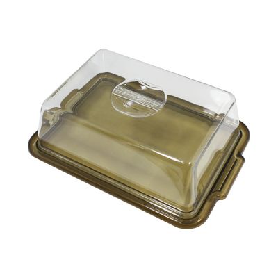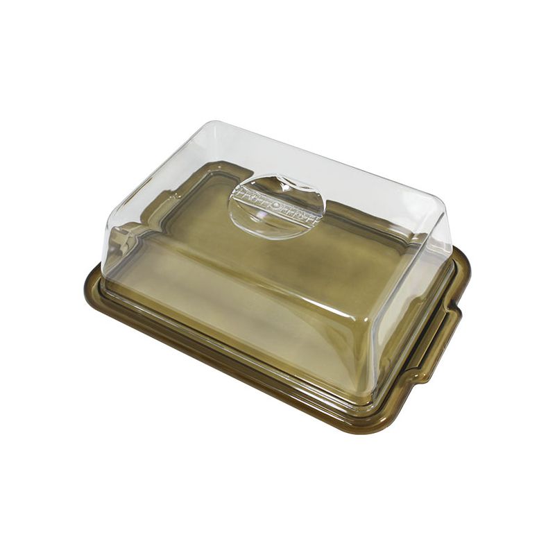 Vassoio rettangolare in PS talpa trasparente e cloche trasparente. È indicato per dolci di massimo 24x16cm oppure può essere usato anche per formaggi e salumi per un aperitivo. Il suo aspetto cristallino e il design semplice rende il prodotto elegante e raffinato, ideale per conservare o servire a tavola.