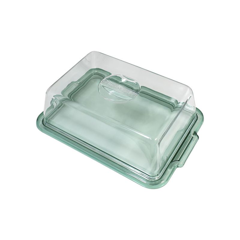 Vassoio rettangolare in PS salvia trasparente e cloche trasparente. È indicato per dolci di massimo 24x16cm oppure può essere usato anche per formaggi e salumi per un aperitivo. Il suo aspetto cristallino e il design semplice rende il prodotto elegante e raffinato, ideale per conservare o servire a tavola.