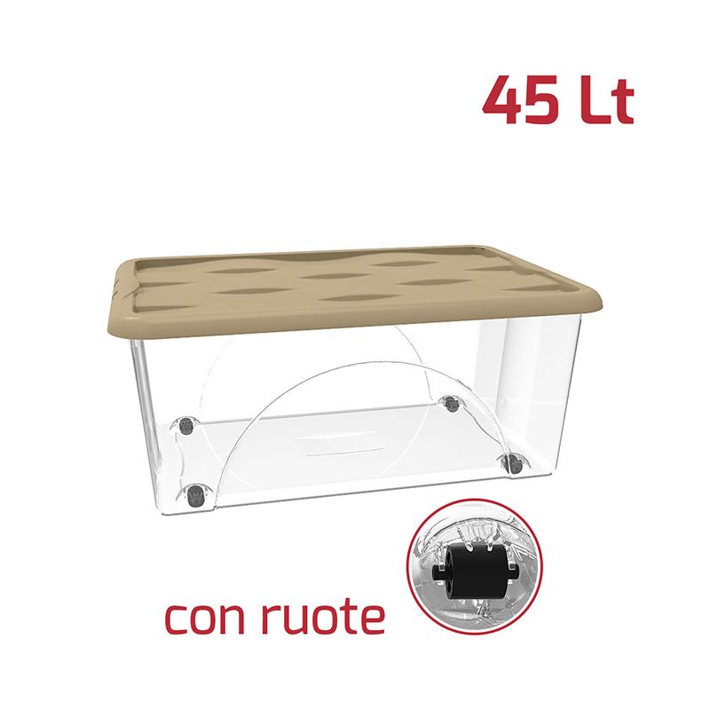 Storage box Dune da 45lt in PP trasparente con coperchio mocha indispensabile nell'organizzazione di tutti gli ambienti. Il coperchio ha un design unico e moderno esaltato dall'incisione presente sulle onde. Leggero ma robusto è l'ideale per contenere abbigliamento, scarpe, giocattoli, libri, attrezzi per il fai da te, accessori per la pulizia... di tutto insomma! Può essere riposto dentro armadi, sgabuzzini, scaffalature, sotto il letto o in soffitta. Le 4 ruote intercambiabili in PP nero si montano in un gesto e potrai decidere in che senso far girare le ruote in base alle tue necessità. Grazie a questo box storage manterrai ambienti domestici e professionali perfettamente ordinati e puliti.