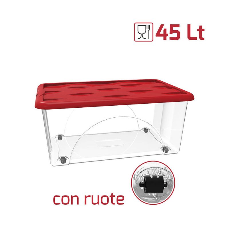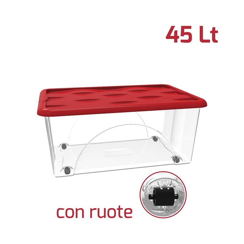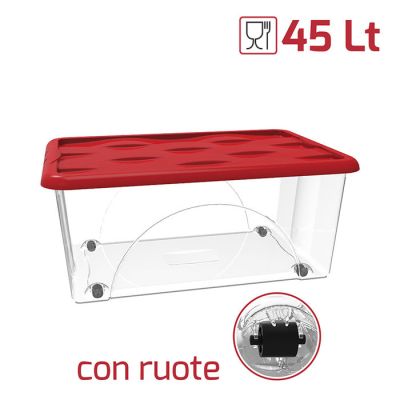 Storage box Dune da 45lt in PP trasparente con coperchio rosso indispensabile nell'organizzazione di tutti gli ambienti. Il coperchio ha un design unico e moderno esaltato dall'incisione presente sulle onde. Leggero ma robusto è l'ideale per contenere abbigliamento, scarpe, giocattoli, libri, attrezzi per il fai da te, accessori per la pulizia... di tutto insomma! Può essere riposto dentro armadi, sgabuzzini, scaffalature, sotto il letto o in soffitta. Le 4 ruote intercambiabili in PP nero si montano in un gesto e potrai decidere in che senso far girare le ruote in base alle tue necessità. Grazie a questo box storage manterrai ambienti domestici e professionali perfettamente ordinati e puliti.
