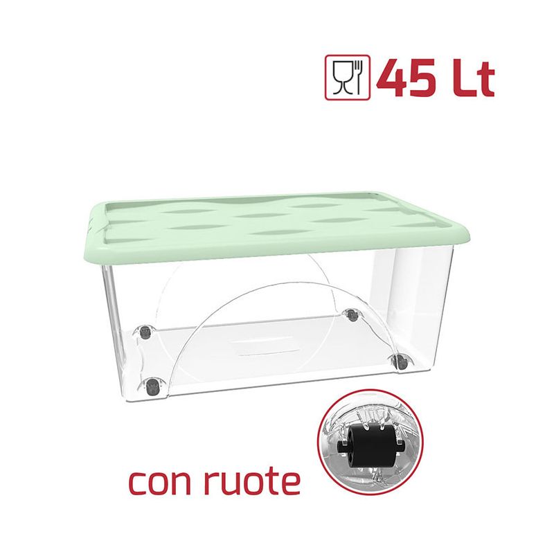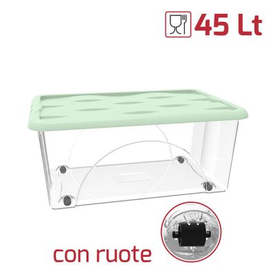 Storage box Dune da 45lt in PP trasparente con coperchio verde salvia indispensabile nell'organizzazione di tutti gli ambienti. Il coperchio ha un design unico e moderno esaltato dall'incisione presente sulle onde. Leggero ma robusto è l'ideale per contenere abbigliamento, scarpe, giocattoli, libri, attrezzi per il fai da te, accessori per la pulizia... di tutto insomma! Può essere riposto dentro armadi, sgabuzzini, scaffalature, sotto il letto o in soffitta. Le 4 ruote intercambiabili in PP nero si montano in un gesto e potrai decidere in che senso far girare le ruote in base alle tue necessità. Grazie a questo box storage manterrai ambienti domestici e professionali perfettamente ordinati e puliti.