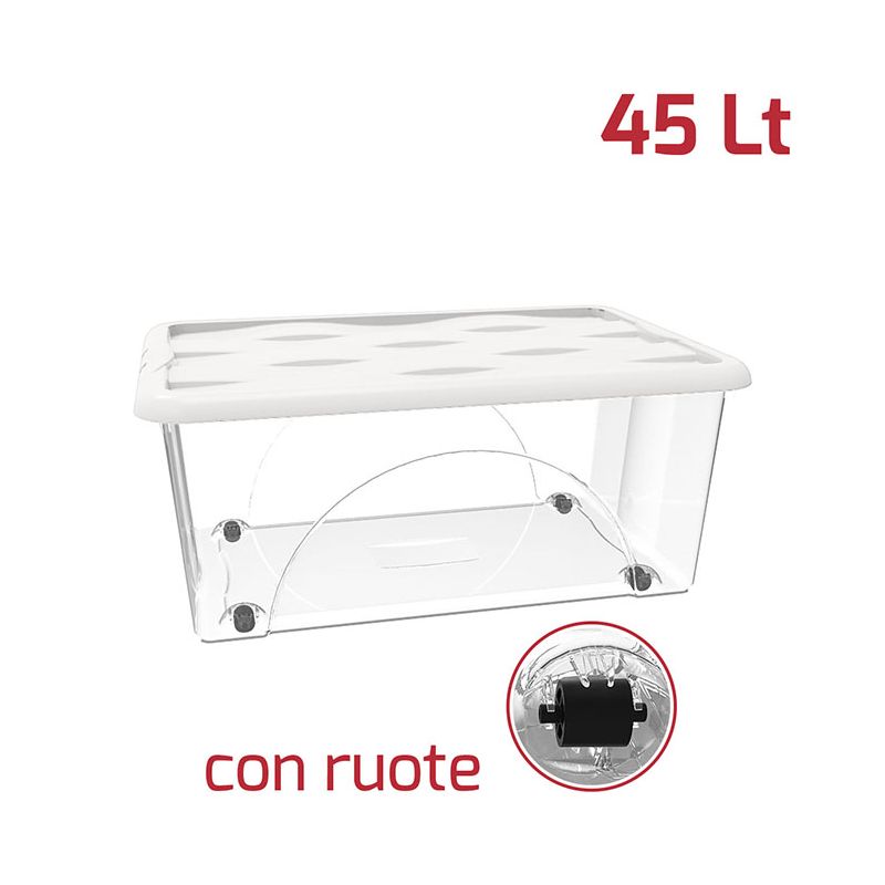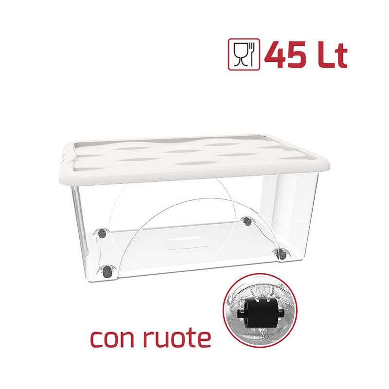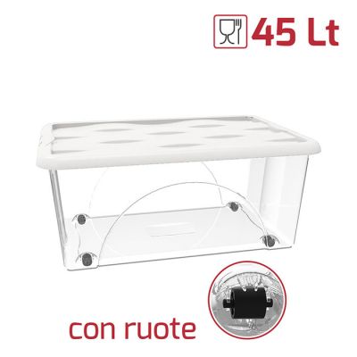 Storage box Dune da 45lt in PP trasparente con coperchio bianco panna indispensabile nell'organizzazione di tutti gli ambienti. Il coperchio ha un design unico e moderno esaltato dall'incisione presente sulle onde. Leggero ma robusto è l'ideale per contenere abbigliamento, scarpe, giocattoli, libri, attrezzi per il fai da te, accessori per la pulizia... di tutto insomma! Può essere riposto dentro armadi, sgabuzzini, scaffalature, sotto il letto o in soffitta. Le 4 ruote intercambiabili in PP nero si montano in un gesto e potrai decidere in che senso far girare le ruote in base alle tue necessità. Grazie a questo box storage manterrai ambienti domestici e professionali perfettamente ordinati e puliti.