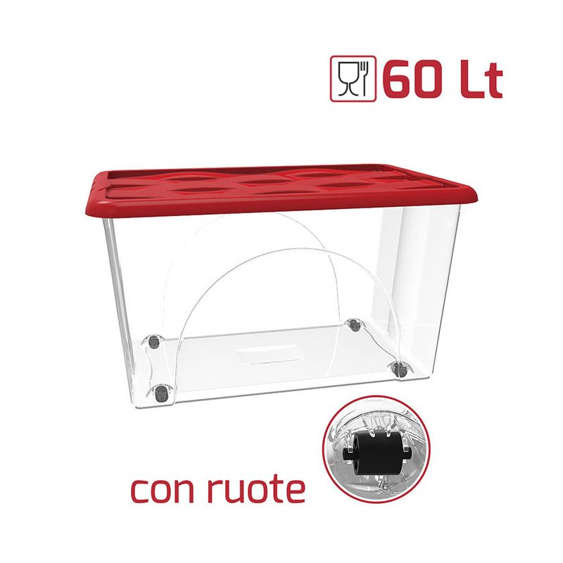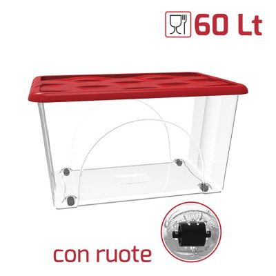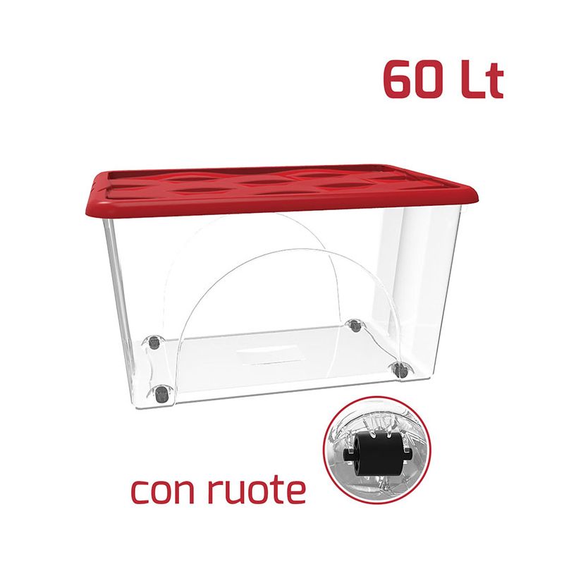 Storage box Dune da 60lt in PP trasparente con coperchio rosso indispensabile nell'organizzazione di tutti gli ambienti. Il coperchio ha un design unico e moderno esaltato dall'incisione presente sulle onde. Leggero ma robusto è l'ideale per contenere abbigliamento, scarpe, giocattoli, libri, attrezzi per il fai da te, accessori per la pulizia... di tutto insomma! Può essere riposto dentro armadi, sgabuzzini, scaffalature, sotto il letto o in soffitta. Le 4 ruote intercambiabili in PP nero si montano in un gesto e potrai decidere in che senso far girare le ruote in base alle tue necessità. Grazie a questo box storage manterrai ambienti domestici e professionali perfettamente ordinati e puliti.
