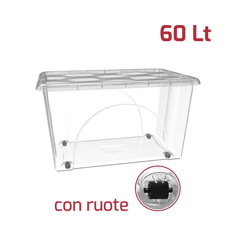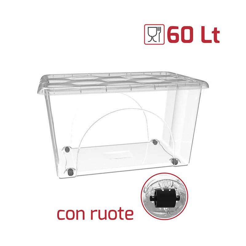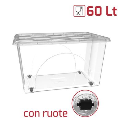 Storage box Dune con coperchio da 60lt in PP trasparente indispensabile nell'organizzazione di tutti gli ambienti. Il coperchio ha un design unico e moderno esaltato dall'incisione presente sulle onde. Leggero ma robusto è l'ideale per contenere abbigliamento, scarpe, giocattoli, libri, attrezzi per il fai da te, accessori per la pulizia... di tutto insomma! Può essere riposto dentro armadi, sgabuzzini, scaffalature, sotto il letto o in soffitta. Le 4 ruote intercambiabili in PP nero si montano in un gesto e potrai decidere in che senso far girare le ruote in base alle tue necessità. Grazie a questo box storage manterrai ambienti domestici e professionali perfettamente ordinati e puliti.