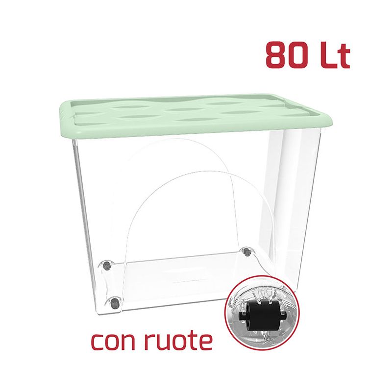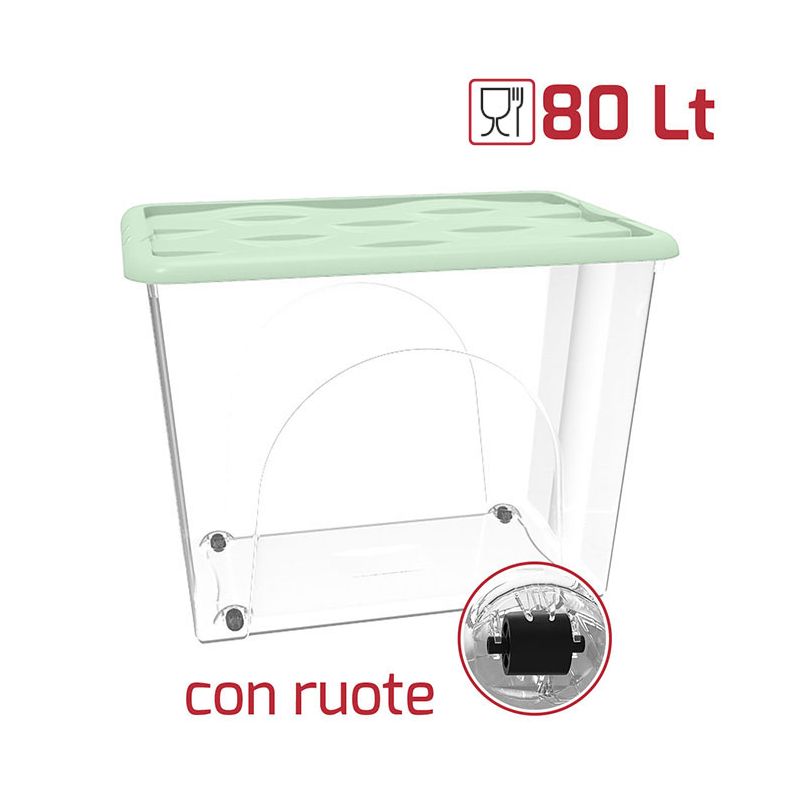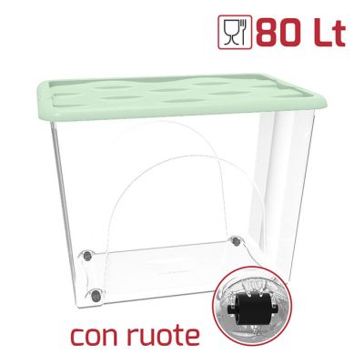 Storage box Dune da 60lt in PP trasparente con coperchio verde salvia indispensabile nell'organizzazione di tutti gli ambienti. Il coperchio ha un design unico e moderno esaltato dall'incisione presente sulle onde. Leggero ma robusto è l'ideale per contenere abbigliamento, scarpe, giocattoli, libri, attrezzi per il fai da te, accessori per la pulizia... di tutto insomma! Può essere riposto dentro armadi, sgabuzzini, scaffalature, sotto il letto o in soffitta. Le 4 ruote intercambiabili in PP nero si montano in un gesto e potrai decidere in che senso far girare le ruote in base alle tue necessità. Grazie a questo box storage manterrai ambienti domestici e professionali perfettamente ordinati e puliti.