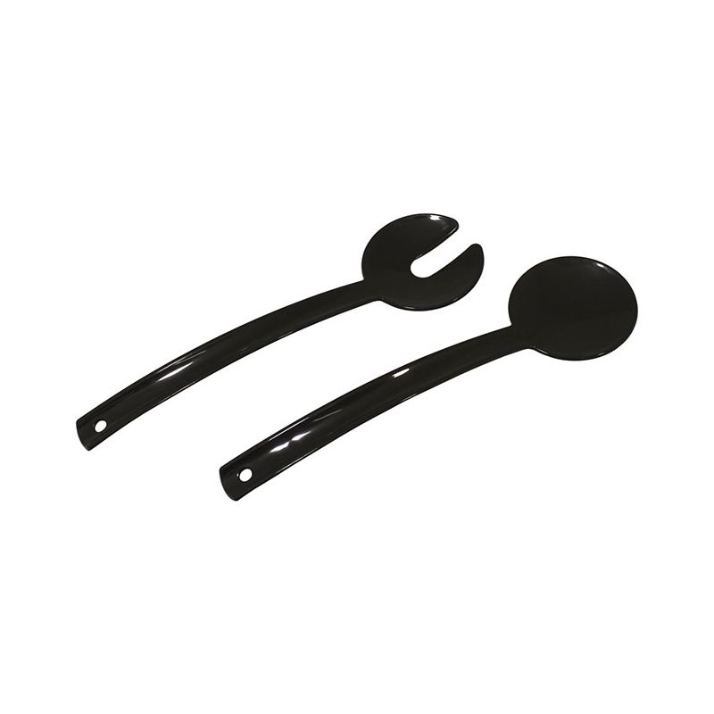 Set di 2 posate per insalata in PP nero caldo. Dal design moderno e funzionale aiutano a mescolare insalate o macedonie anche nelle ciotole più grandi grazie ai lunghi manici. La loro forma le rende poco ingombranti da tenere in un cassetto ma essendo forate sul manico si possono anche appendere. Sono certificate per il contatto alimentare e lavabili in lavastoviglie.