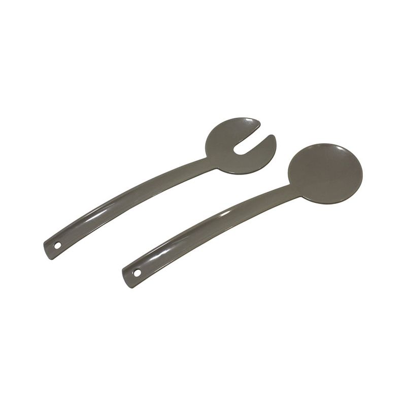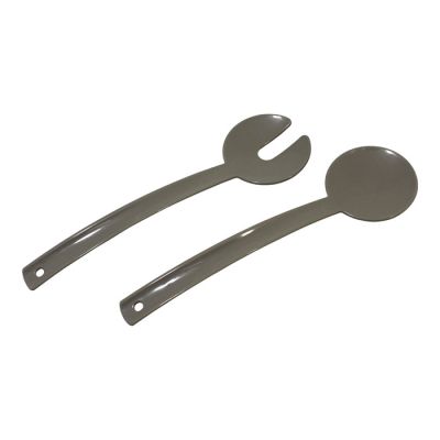 Set di 2 posate per insalata in PP grigio caldo. Dal design moderno e funzionale aiutano a mescolare insalate o macedonie anche nelle ciotole più grandi grazie ai lunghi manici. La loro forma le rende poco ingombranti da tenere in un cassetto ma essendo forate sul manico si possono anche appendere. Sono certificate per il contatto alimentare e lavabili in lavastoviglie.