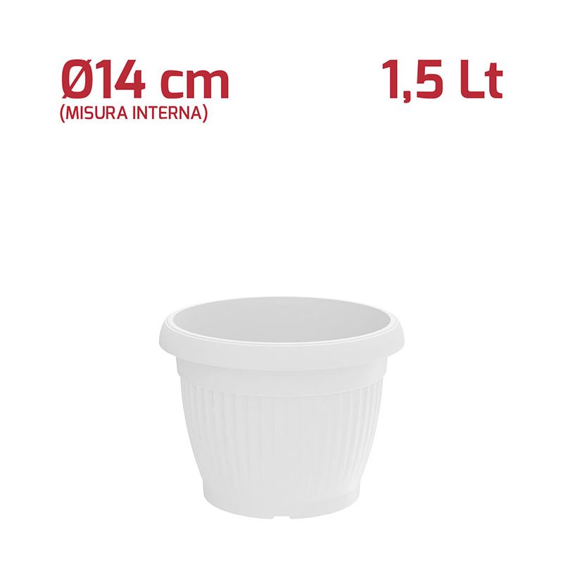 Vaso tondo Gaia in PP bianco. Vaso dal design moderno utilizzabile sia all'esterno che all'interno grazie ai materiali di alta qualità e si adatta bene a qualsiasi stile. Sul fondo sono presenti i fori per lo scolo dell'acqua in eccesso. A parte è possibile acquistare il sottovaso.