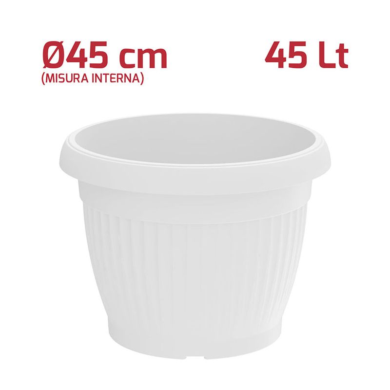 Vaso tondo Gaia in PP bianco. Vaso dal design moderno utilizzabile sia all'esterno che all'interno grazie ai materiali di alta qualità e si adatta bene a qualsiasi stile. Sul fondo sono presenti i fori per lo scolo dell'acqua in eccesso. A parte è possibile acquistare il sottovaso.