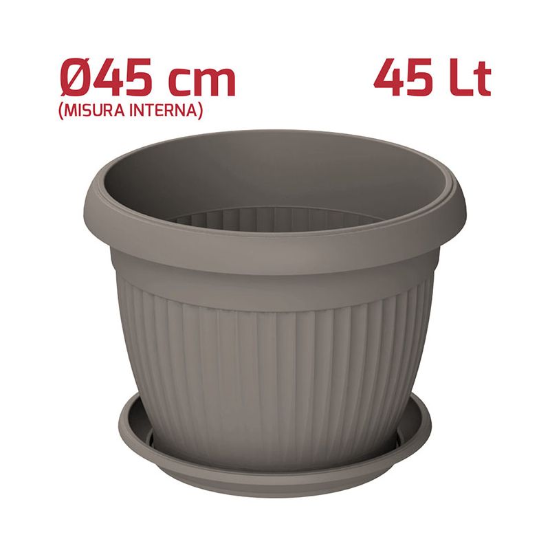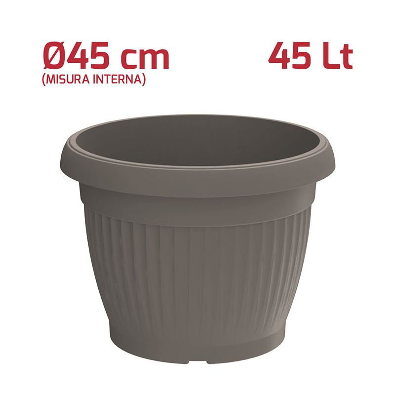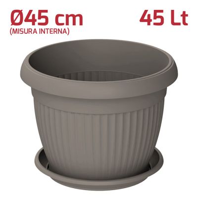 Vaso tondo Gaia in PP grigio. Vaso dal design moderno utilizzabile sia all'esterno che all'interno grazie ai materiali di alta qualità e si adatta bene a qualsiasi stile. Sul fondo sono presenti i fori per lo scolo dell'acqua in eccesso. A parte è possibile acquistare il sottovaso.