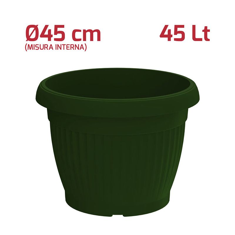 Vaso tondo Gaia in PP verde. Vaso dal design moderno utilizzabile sia all'esterno che all'interno grazie ai materiali di alta qualità e si adatta bene a qualsiasi stile. Sul fondo sono presenti i fori per lo scolo dell'acqua in eccesso. A parte è possibile acquistare il sottovaso.