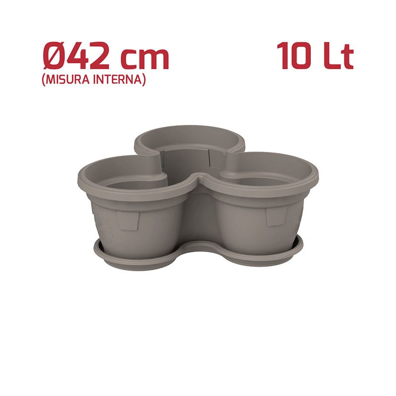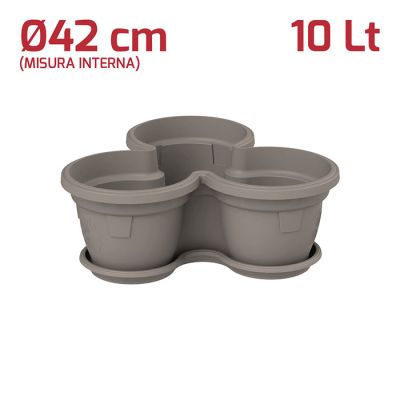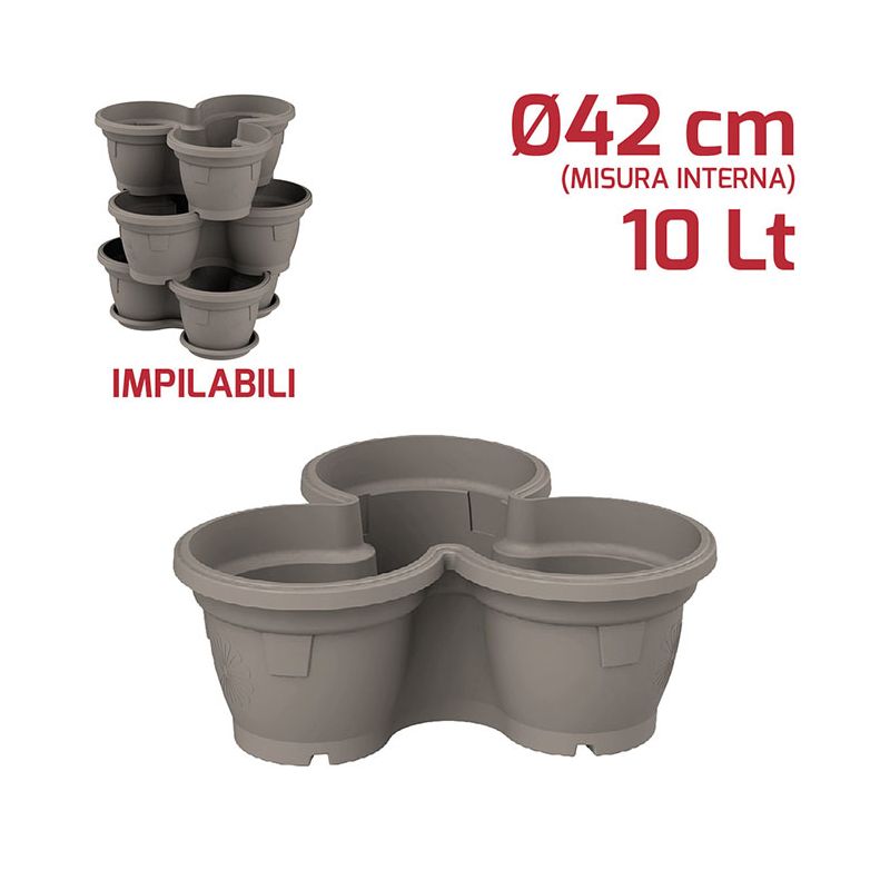 Vaso Trio impilabile in PP grigio. Pratico vaso utilizzabile sia all'esterno che all'interno grazie ai materiali di alta qualità. La possibilità di impilarli permette si sfruttare al massimo gli spazi ed è perfetto per piante di piccole dimensioni, come ad esempio le erbe aromatiche così da averle sempre a disposizione. Sul fondo è presente un foro per lo scolo dell'acqua in eccesso. A parte è possibile acquistare il sottovaso.