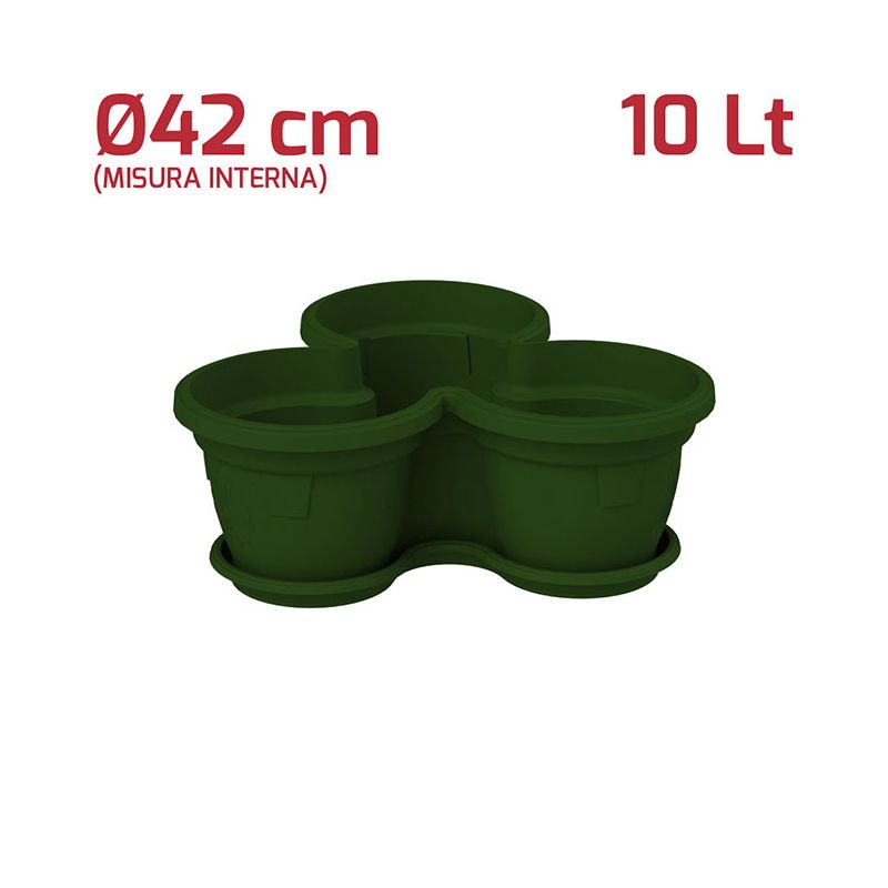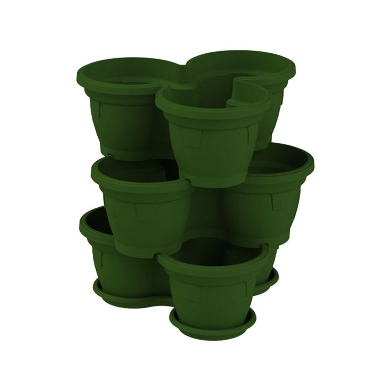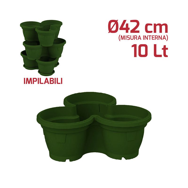 Vaso Trio impilabile in PP verde. Pratico vaso utilizzabile sia all'esterno che all'interno grazie ai materiali di alta qualità. La possibilità di impilarli permette si sfruttare al massimo gli spazi ed è perfetto per piante di piccole dimensioni, come ad esempio le erbe aromatiche così da averle sempre a disposizione. Sul fondo è presente un foro per lo scolo dell'acqua in eccesso. A parte è possibile acquistare il sottovaso.
