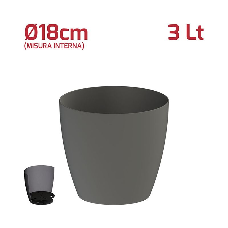 Vaso rotondo Fuji in PP grigio con ghiera interna per il drenaggio dell'acqua. Dalla linea semplice, pulita ed elegante si adatta a qualsiasi ambiente sia interno che esterno. La superficie lucida e la ghiera removibile permette una pulizia veloce e completa.
