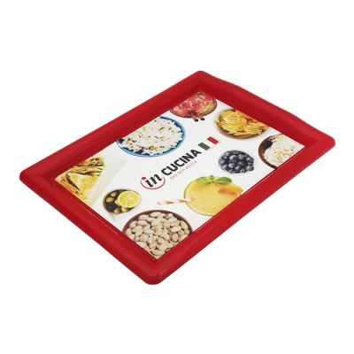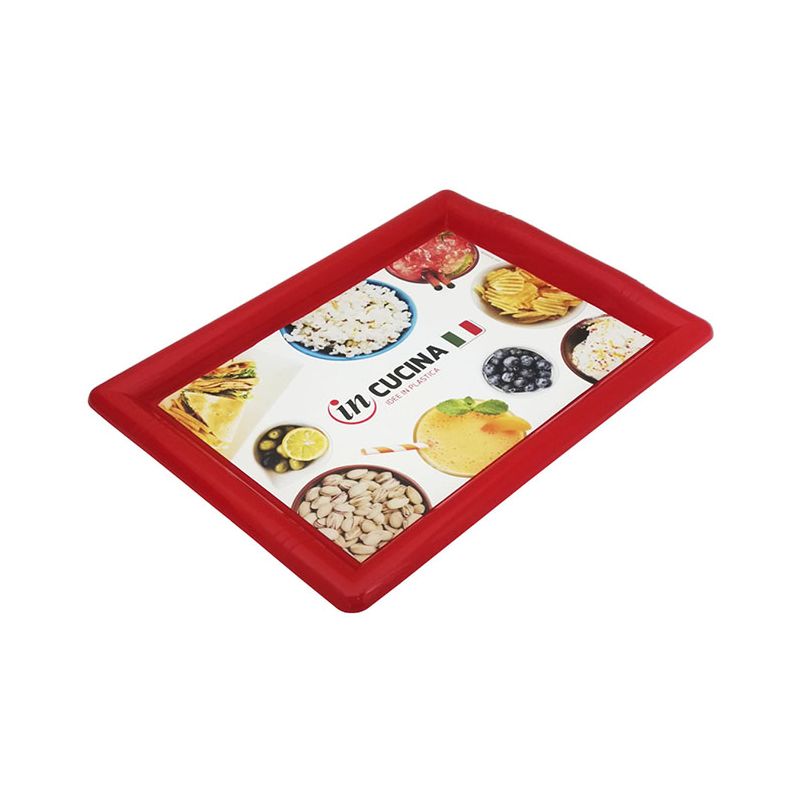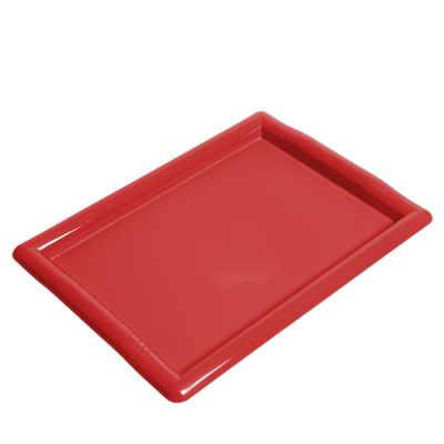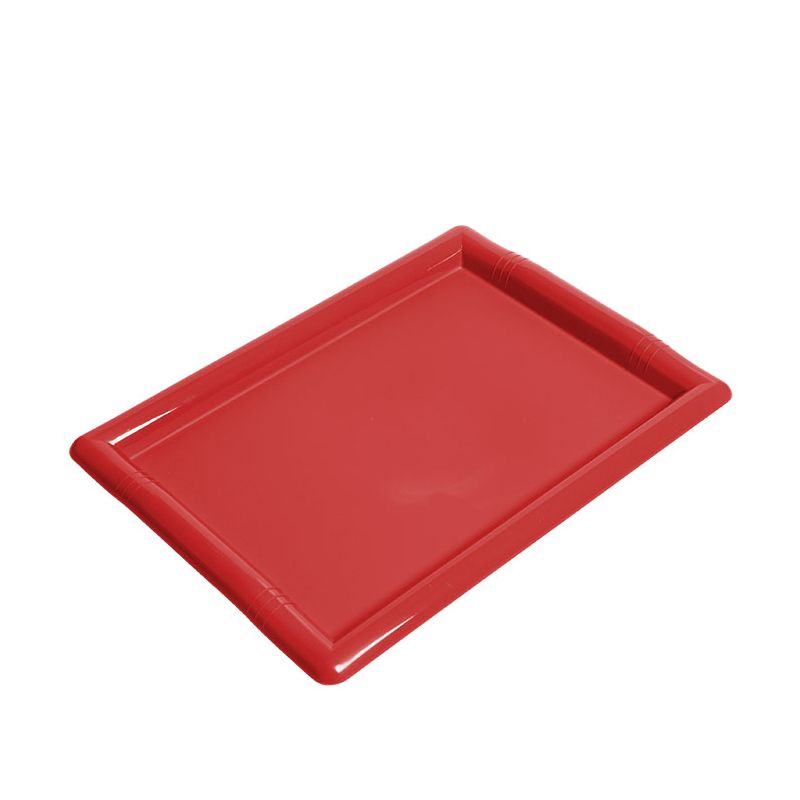 Vassoio rettangolare Art in PP rosso dal design classico. Il bordo basso limita l'ingombro nello scaffale e l'ampio piano d'appoggio satinato è utile per servire anche le portate più grandi. Lavabile in lavastioviglie e certificato per il contatto alimentare.