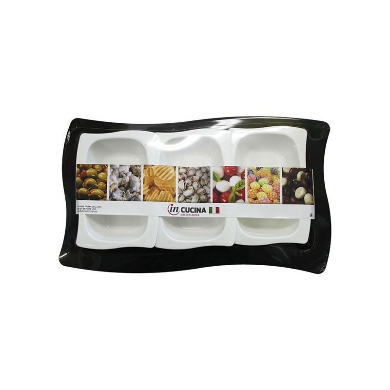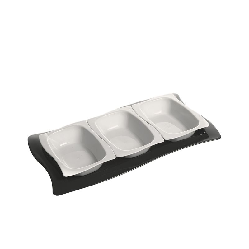 Set in PP comprensivo di vassoio nero e 3 vaschette bianche. Caratterizzato da un profilo ondulato che ne esalta la particolarità, è ideale per aperitivi o feste in quanto permette di portare in tavola 3 diversi alimenti alla volta. Possono essere salatini, caramelle, formaggi, salse, cioccolatini o biscotti. Gli elementi che compongono il set sono belli e utili anche usati singolarmente a seconda delle necessità. La combinazione del bianco e del nero rende il set sempre elegante permettendoti di utilizzarlo sia nelle occasioni domestiche che professionali. L’intero set è riutilizzabile e lavabile in lavastoviglie.